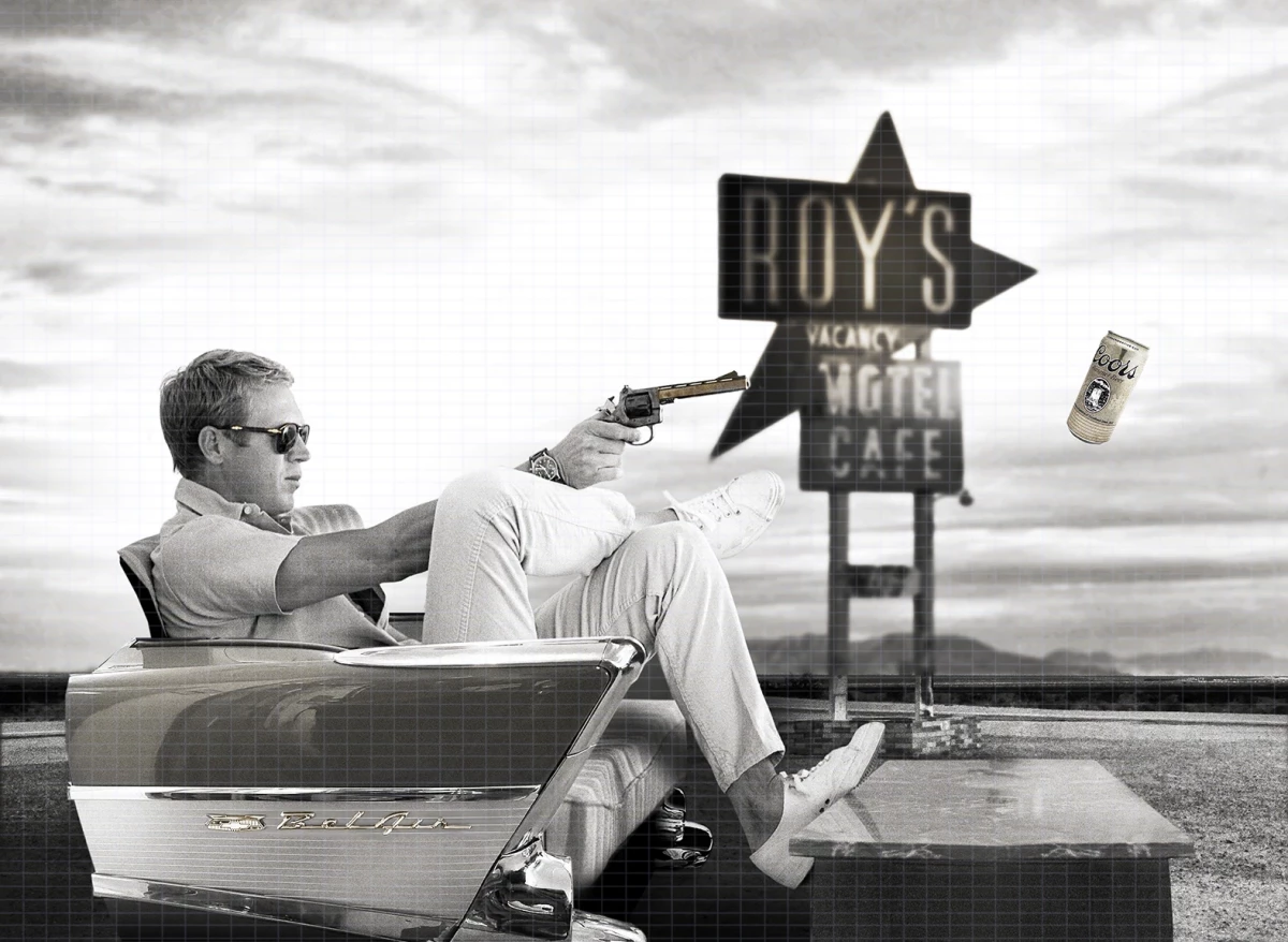 Allstar Steve McQueen, lässig versunken mit überschlagenen Beinen im Polster, das wie der Rücksitz eines Bel Air gebaut ist, richtet den Blick nicht auf die Ferne, sondern auf ein Ziel in Armlänge. Die Coors-Dose ist bereits im Flug, der unsichtbare Schussmoment hängt zwischen beiden, wie ein gespanntes Band. Hinter ihm das flackernde Versprechen von Roy’s Motel Café, eins dieser Schilder, die mehr über die Leere von Freiheit erzählen als jedes Drehbuch. Nichts in dieser Szenerie geschieht zufällig: das Sitzen, das Zielen, das Schweben der Dose. Alles ist eingefroren in einem horiztontalen Augenblick, der irgendwie zugleich knallt und schweigt.
