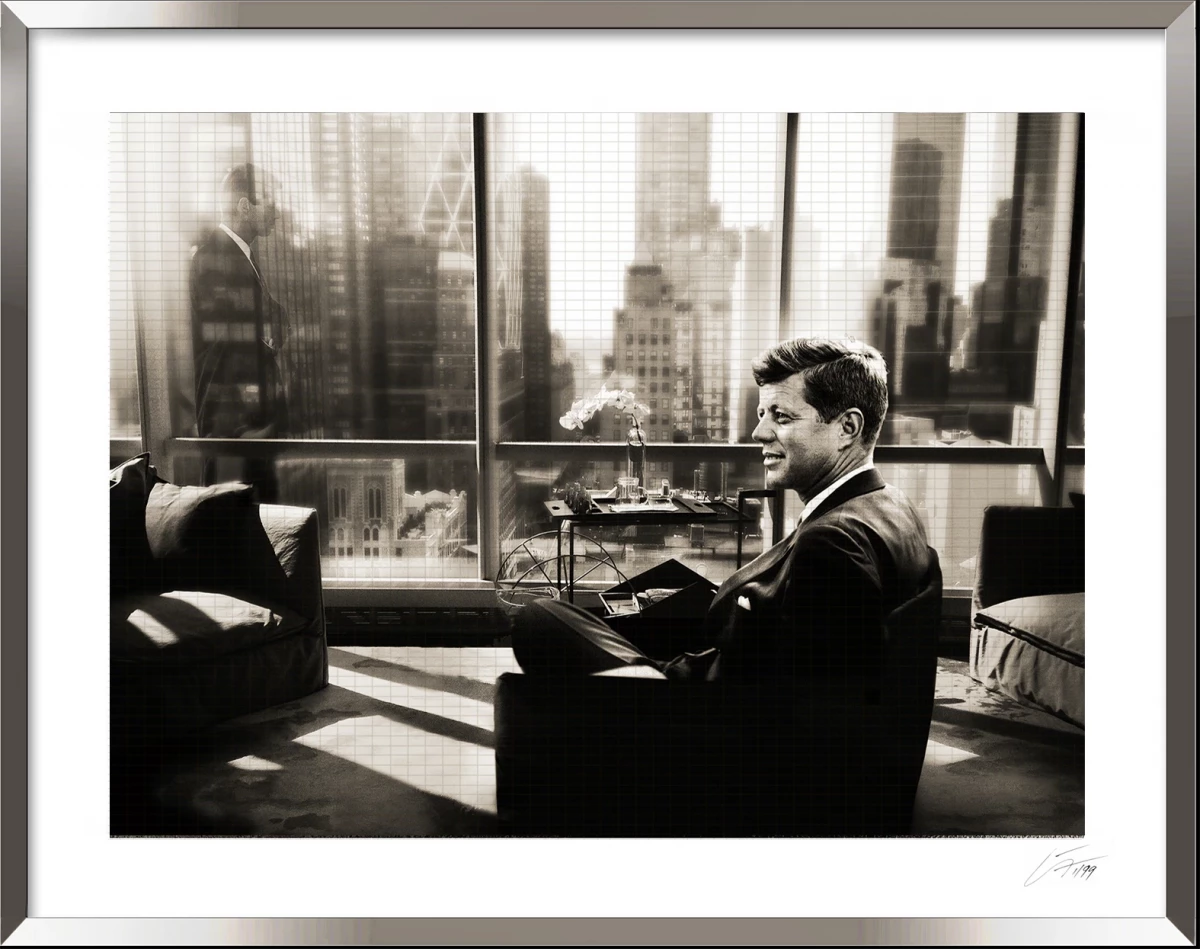 Doppelte Wahrnehmung: die Faszination für die Strahlkraft Kennedys, eingebettet in die Eleganz der Szene, und zugleich die Ahnung, dass sein Moment nicht allein ist. Die Spiegelung offenbart ein unsichtbares Gegenüber, ein stilles Pendant, das seinen Blick begleitet und ihm Tiefe verleiht. Kennedy sitzt in einer Atmosphäre von Luxus und Weltläufigkeit, lässig und zugleich konzentriert. Sein Lächeln wirkt offen, doch sein Blick geht an uns vorbei, ins Ungefähre, als richte er sich an etwas, das nicht sichtbar ist. Dieser abgewandte Blick hält uns fest, weil er uns ausschließt und gerade dadurch ein starkes Bedürfnis weckt, ihm zu folgen. Dialogspannung. In der Spiegelung tritt die Gestalt eines Mannes auf, unscharf, im Hintergrund der Fassaden verankert. Er wirkt wie ein Gesprächspartner, der keine Worte braucht – präsent, aber namenlos. Wenn man ins Historische geht, könnte man an enge Vertraute wie Robert F. Kennedy (Bruder und Justizminister), Kenny O’Donnell (enger Wahlkampfmanager und später Stabschef) oder Ted Sorensen (Redenschreiber) denken. Alle begleiteten ihn häufig auch zu offiziellen Terminen. Dadurch verschiebt sich die Szene vom reinen Porträt in ein Beziehungsbild: Kennedy im Vordergrund, charismatisch und glänzend, und im Hintergrund das Echo eines Dialogs, das den Glanz weiterträgt und zugleich in Frage stellt. So verwandelt ›Manhattan‹ das Bild einer Ikone in eine Chiffre für Sichtbarkeit und Unsichtbarkeit, für Anziehung und Ferne. Wir sehen den einstigen Präsidenten – und zugleich spüren wir die Kräfte, die um ihn kreisten, ohne je ins Licht zu treten.