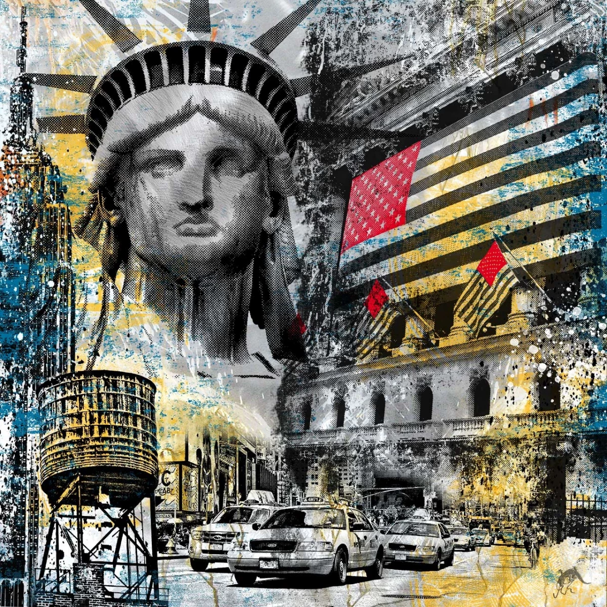 In dieser collageartigen Arbeit ruft Devin Miles das visuelle Gedächtnis von New York City auf: Die ikonische Freiheitsstatue, gelbe Taxis, ein Wasserturm, Wall Street und Empire State Building verdichten sich zu einem urbanen Palimpsest. Die US-Flaggen erscheinen verfremdet – ihre Sterne zu roten Dreiecken umgewandelt, die Streifen horizontal verschoben – was den patriotischen Pathos in Frage stellt. Miles nutzt Techniken der Pop Art, der Street Art und des Siebdrucks, um Monumente amerikanischer Identität in ein neues Spannungsverhältnis zu setzen: zwischen Glanz und Kritik, Ikone und Überlagerung.