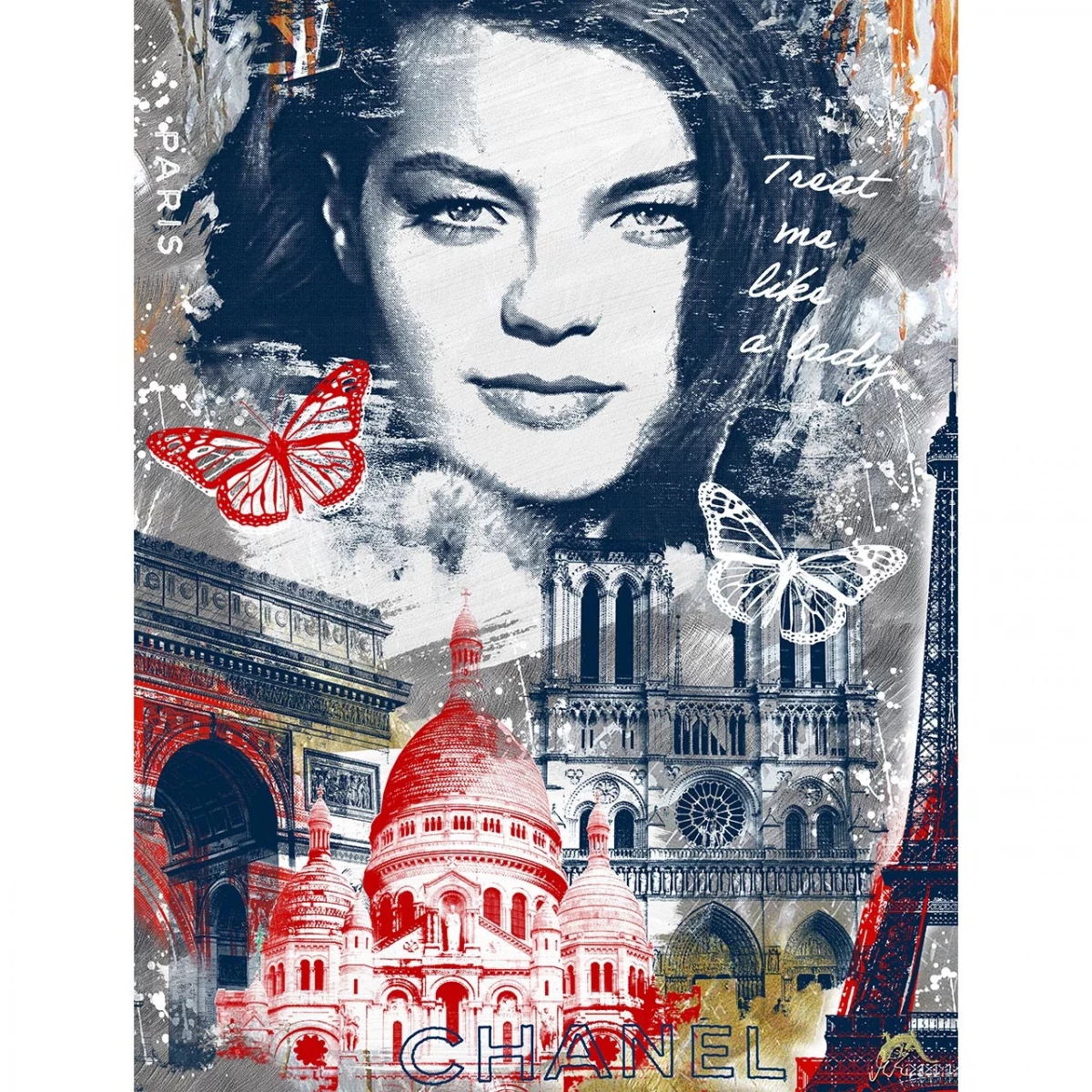 In dieser Arbeit inszeniert Devin Miles Paris als Mythos zwischen Mode, Architektur und Projektion: Das Gesicht der Schauspielerin Romy Schneider bildet das Zentrum der Komposition – selbstbewusst, direkt, mit einer Spur Melancholie. Umgeben von ikonischen Bauwerken wie Notre-Dame, Sacré-Cœur, dem Arc de Triomphe und dem Eiffelturm entsteht ein vielschichtiges Bild der Stadt, akzentuiert durch die Schrift Treat me like a lady und das Markenlogo Chanel. Zwei Schmetterlinge, einer rot, einer weiß, setzen einen Kontrapunkt zur Monumentalität der Architektur. Sie stehen für Leichtigkeit, Wandel und Vergänglichkeit – Motive, die auch Romy Schneiders Lebensweg durchziehen. Die Farbgebung in Blau, Weiß und Rot zitiert die französische Trikolore und verleiht dem Bild eine kulturell aufgeladene, zugleich stilisierte Präsenz.