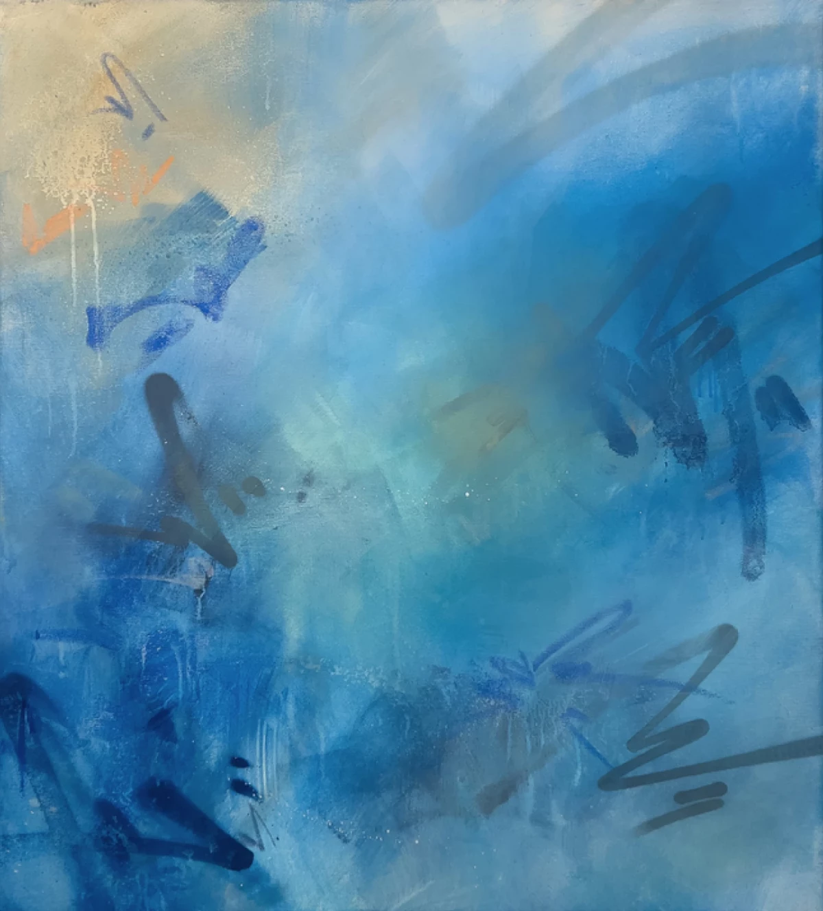 „Out of the Sea“ von Isyah Asher arbeitet mit gestischer Abstraktion und einer Palette maritimer Blautöne, die Tiefe und Bewegung erzeugen; spontane Markierungen und lasierende Schichten verweisen auf Einflüsse des Action Paintings und der Farbfeldmalerei.