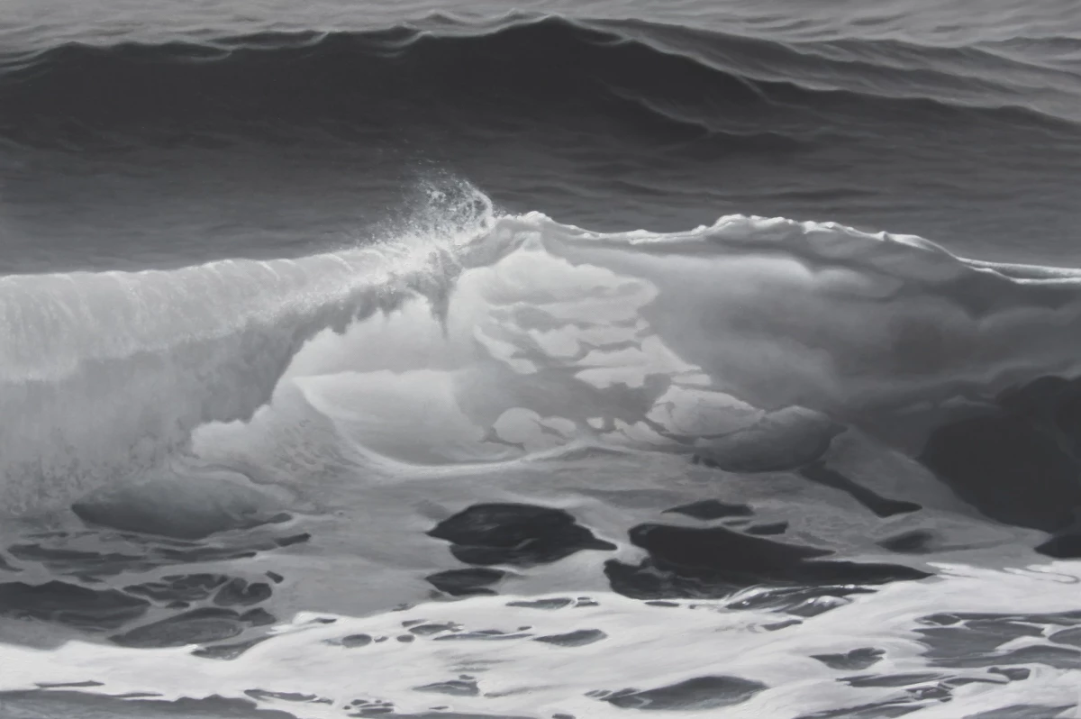 Die Wellen begegnen sich in eigener Bewegung, sie schlagen aneinander, klatschen sich ab und brechen wieder auseinander. Das Wasser türmt sich auf, fällt zurück und trägt in seinen Flächen helle Muster wie aufgewirbelte Wolken. Die dunklen Partien im Vordergrund sind keine festen Körper, sondern schweres Wasser, verdichtet, ohne Schaum. Der Schaum selbst zieht feine Schleier darüber, erhellt die Oberfläche und lässt sie vibrieren. So entsteht ein Bild voller Gegensätze von Auftrieb und Gewicht, von Glanz und Tiefe. Sylt an einem frühen Morgen.