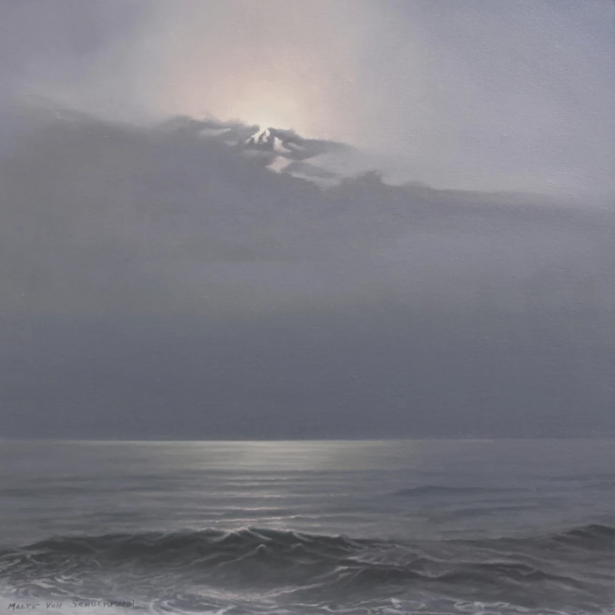 Der geladene Augenblick, in dem sich das Wetter wendet. Über der geschlossenen Wolkendecke bricht zart das Licht hervor, gedämpft und doch eindringlich, es taucht den Himmel in ein fahles Leuchten mit einem Hauch von Rosa. Auf dem Meer zieht sich dieser Schimmer als schmale Bahn, die Oberfläche verharrt still, als hielte sie den Atem an. Im Vordergrund baut sich eine dunkle Welle auf, schwer und zurückhaltend, sie verstärkt die Ahnung dessen, was sich ankündigt. Die Farbigkeit bleibt kühl und leise, das Licht erscheint wie eine Öffnung, ein Versprechen inmitten der Dämmerung. Spannung pur.