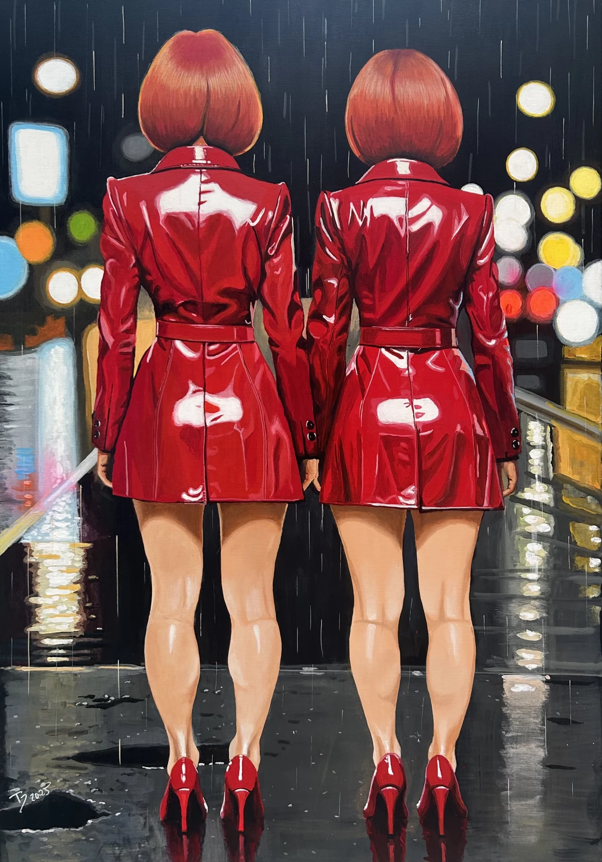 Thomas Düwer erschafft zwei Variationen derselben Figur, die sich wie gespiegelt behaupten und aneinander ihre Reize verstärken. Die Komposition lebt von der strengen Frontalität der Rückenansichten, der Präzision der Silhouetten und dem überbordenden Glanz der Lackmäntel. Zugleich wirkt die Ikonografie des Doppelten wie eine feine Sinnestäuschung, die den Blick steuert, noch einmal hinzusehen. Die rote Version zeigt nächtliche Stadt mit nassem Asphalt, Reflexen und einem leisen Unruhepegel. Die Farbe glänzt nass, wie ein erträumter Akzent. Die blaue Variante öffnet den Raum, bringt Klarheit, neue Dimension und eine kühle Eleganz. Die beiden Werke stehen nicht im Wettstreit, sondern erweitern das Thema der Silhouetten auf zwei Stimmungsachsen und geben ihm eine Art visuelle Quadratur. Düwers Bildsprache trägt in Rot wie in Blau denselben entschlossenen Rhythmus. Die Frage nach der Lieblingsfarbe bleibt bewusst offen, und man möchte beide Werke zugleich mitnehmen, um die Konsequenzen der Vervierfachung im eigenen Raum weiter diskutieren zu können.