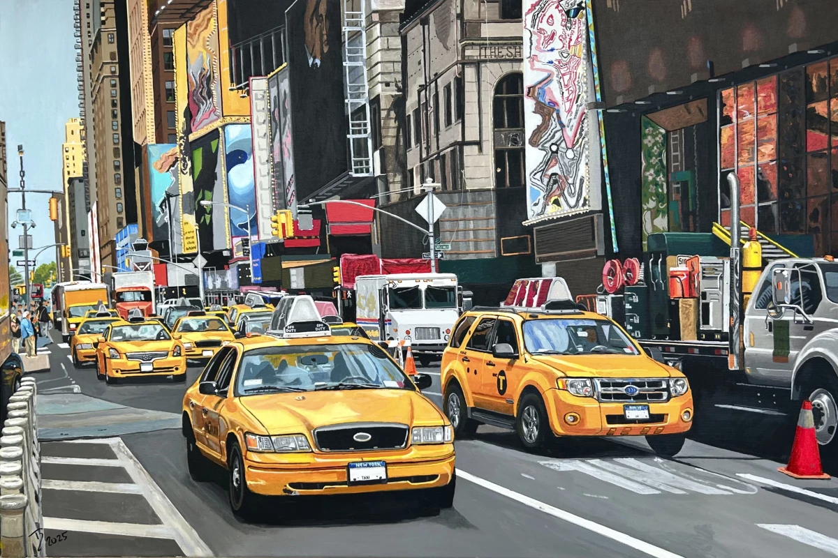 In dieser Variante von NYC Taxi verknüpft Thomas Düwer erneut urbanes Leben, Ikonografie und visuelle Überreizung zu einer malerisch kontrollierten Komposition. Das Motiv ist vertraut: eine Kolonne gelber Taxis im Zentrum Manhattans, eingefroren in Bewegung, verdichtet zu einem Bild urbaner Identität. Doch der Bildausschnitt ist enger, die Perspektive steiler, die Spannung unmittelbarer. Das Resultat ist nicht nur ein Abbild der Stadt – sondern ein Kommentar auf ihre visuelle Kodierung. Die Taxis sind nicht bloß Fahrzeuge – sie sind Leitsysteme, rhythmische Elemente, gelbe Marker im Fluss der Stadt. Ihre glänzenden Karosserien spiegeln das Licht, nehmen die Farben der Umgebung auf, vernetzen sich mit den Werbetafeln, Ampeln, Schildern. Besonders die plastische Modellierung des linken Ford Crown Victoria wirkt beinahe emblematisch – ein urbanes Wappentier, das aus der Fläche herauszutreten scheint. Düwers Malweise oszilliert zwischen dokumentarischer Präzision und kalkulierter Flächigkeit. Die Fassade der Gebäude rechts bleibt blockhaft, schwer, fast ornamental. Dagegen entwickeln die Leuchttafeln links eine Bewegung nach oben, als wollten sie den Bildraum verlassen. Manche Bildflächen wirken wie abstrahiert – etwa das weiße Lieferfahrzeug mit seiner flächigen Schattierung – während andere Partien, wie die Front des rechten Taxis, fast fotorealistisch erscheinen. Besonders kunsthistorisch bemerkenswert ist Düwers Umgang mit Zeitgenossenschaft: Die Komposition erinnert an fotografische Großstadtporträts der 1970er, nimmt aber auch die Überlagerung visueller Reize aus der Pop Art auf. Die Malerei bildet nicht nur das Dargestellte, sondern auch das Gesehene ab – den Blick auf eine Stadt, die längst Bild geworden ist. NYC Taxi steht damit exemplarisch für Düwers malerisches Verfahren: präzise, durchkalkuliert, nie illustrativ. Es ist eine Form der urbanen Stillstellung: ein Moment zwischen Verkehr und Verdichtung, zwischen Oberfläche und Ikonografie. Ein New York, das nicht erzählt wird, sondern sich selbst ausstellt.
